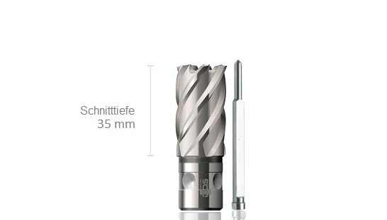 Kernbohrer aus Werkzeugstahl mit hohem Cobaltanteil für größere Hitzebeständigkeit und Verschleißschutz. Für Quick-In Aufnahmesystem. 18 mm Schaft für Quick-In Aufnahmesystem. 35 mm Schnitttiefe