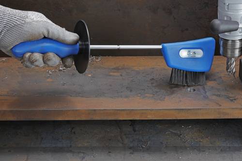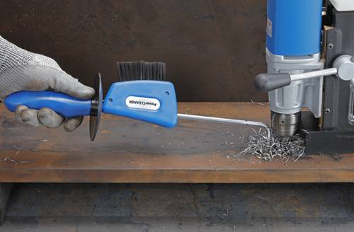 Mit Spänehaken zum entfernen der Bohrspäne und arretierbarer Reinigungsbürste zum reinigen der Arbeitsfläche.